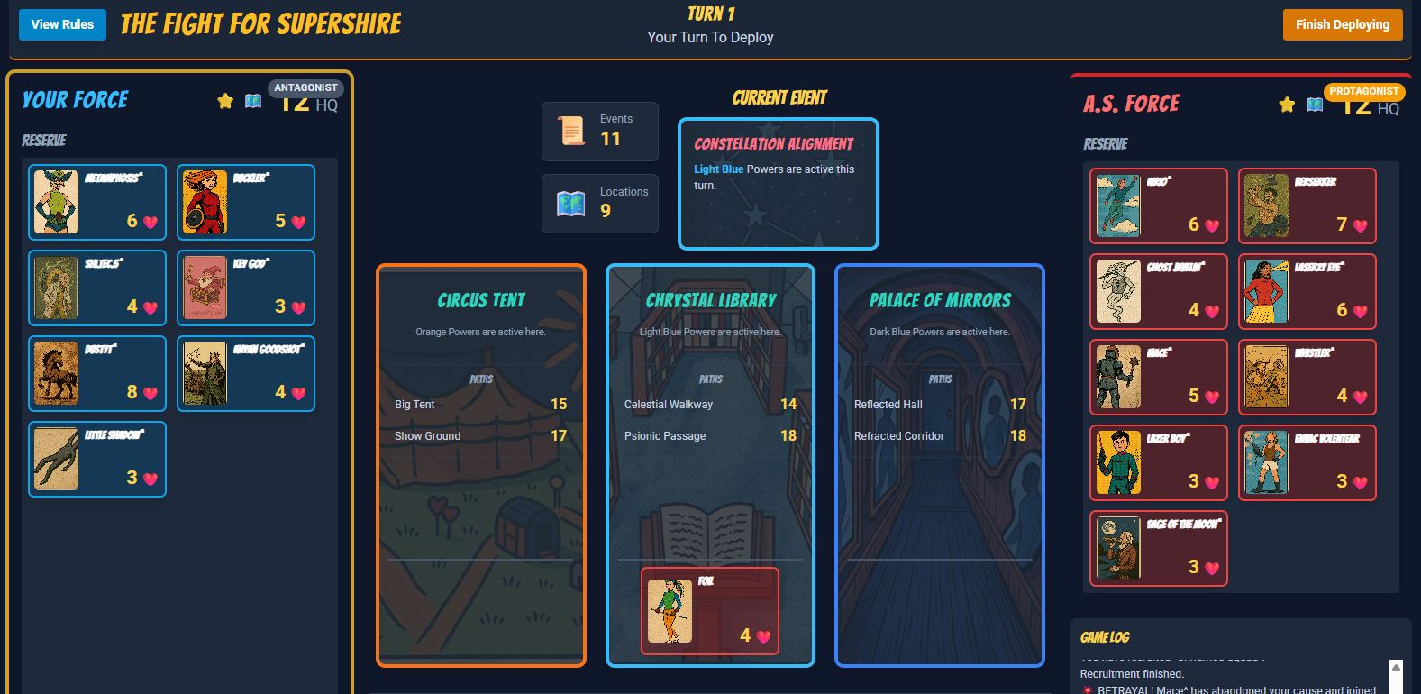 Turn over an Event and Location, repair your HQ, deploy your forces, choose a location to fight, let survivors race along Paths toward an HQ raid… then reload and repeat until victory or disaster.